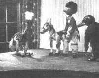 Muffin went from strength to strength, clumping around legs-a-kimbo on the piano top with Annette playing the music and Ann Hogarth standing on the piano to operate him from behind a partition. Further sidekicks emerged as the shows went on, including a bossy penguin called Mr. Peregrine Esquire; a rather shy Louise the Lamb; Oswald the Ostrich (a slightly dim-witted bird inclined to "gape"); Willie the Worm; plus a genial minstrel puppet called Wally the Gog. There were many others including Peter the Pup; Poppy the Parrot; Grace the Giraffe; Hubert the Hippo; Katy the Kangaroo; Kirri the Kiwi; Monty the Monkey; Maurice and Doris the mice; Zebbie the Zebra; Sally the Sea-lion and Prudence and Primrose Kitten who were later rewarded with their own spin-off shows.
